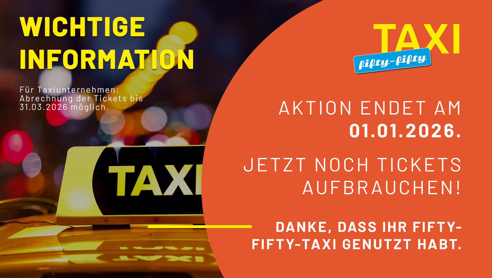 Wenn du zwischen 16 und 26 Jahren alt bist, zahlst du für ein Fifty-Fifty-Taxi-Ticket nur 1,25 €, kannst aber im Wert von 2,50 € Taxi fahren. Die Tickets sind kombinierbar und können in teilnehmenden Taxis für die Hin- und Rückfahrt zur Disco, öffentlichen Veranstaltung oder Privatparty genutzt werden.